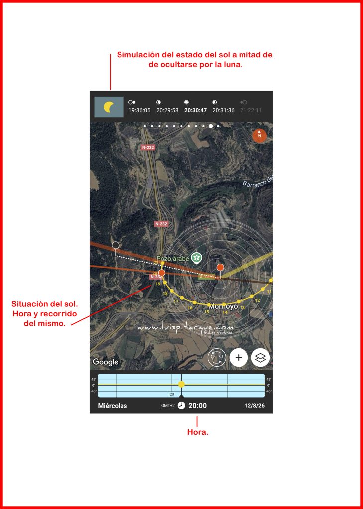 A continuación situación del sol oculto al 50% por la luna a las 20:00 horas.