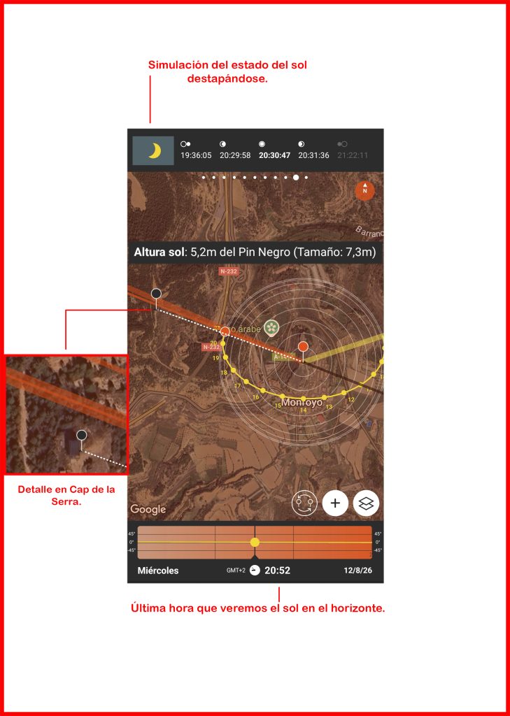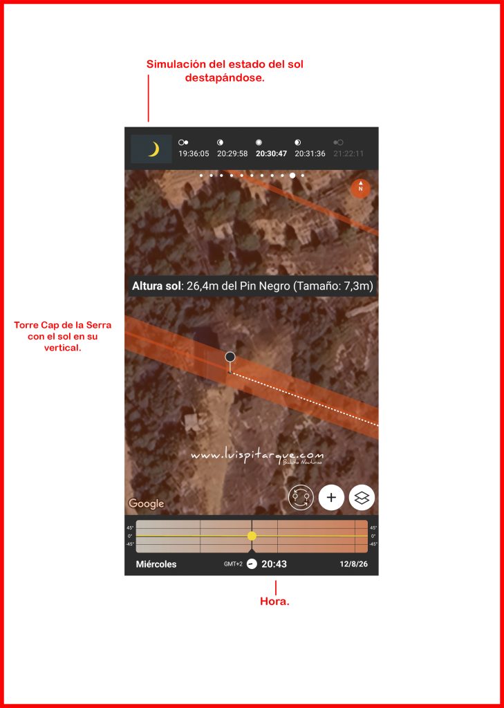 A las 20:43, tendremos exáctamente el sol sobre la torre del Cap de la Serra, a una altura sobre ella de 26 mts, y destapándose el sol.